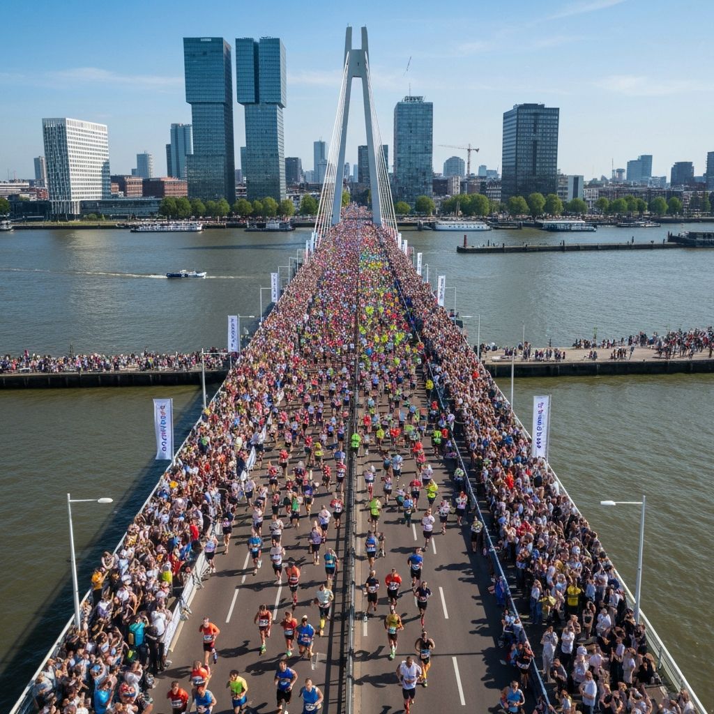 PopulairHardlopenNeem deel aan of beleef de sfeer van de befaamde Rotterdam Marathon, een van Europa's snelste routes.